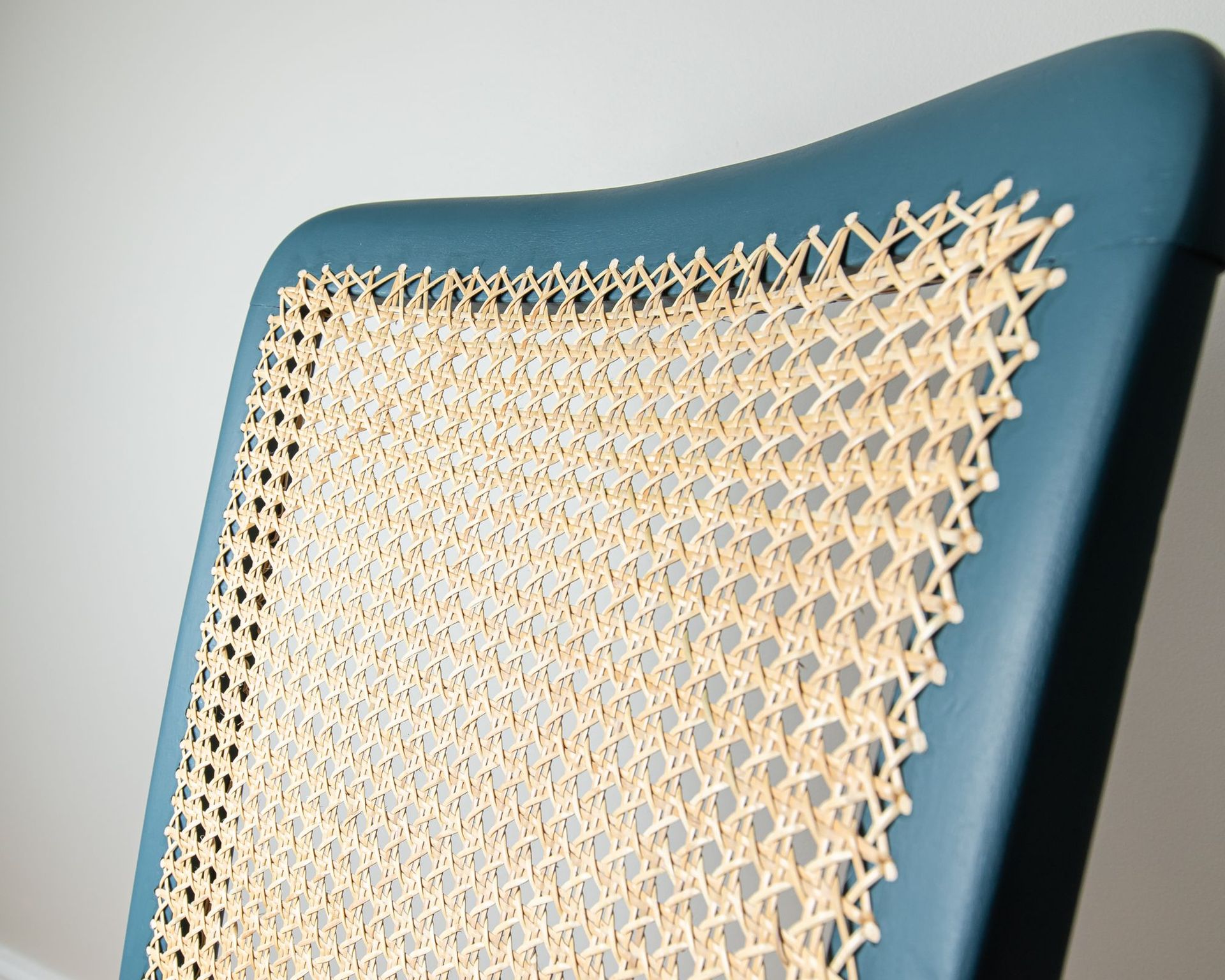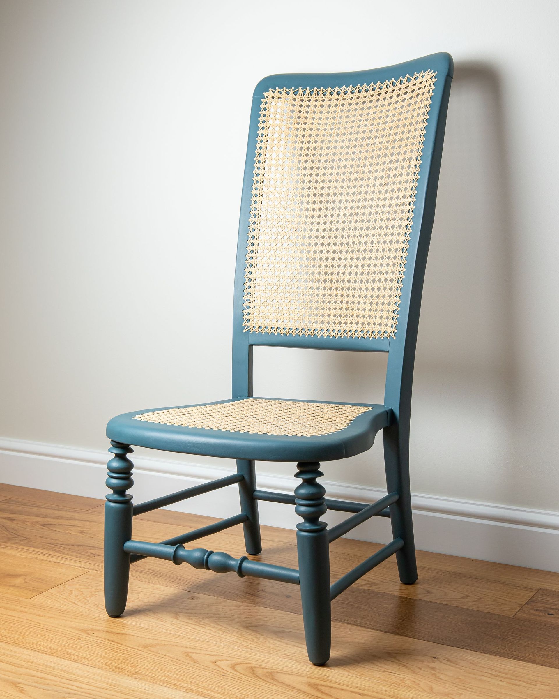 This blue nursing chair was a complete makeover as it arrived completely covered in white paint, cane included. It was stripped back, repaired, repainted in Fusion Mineral Homestead Blue, and fully re-caned.