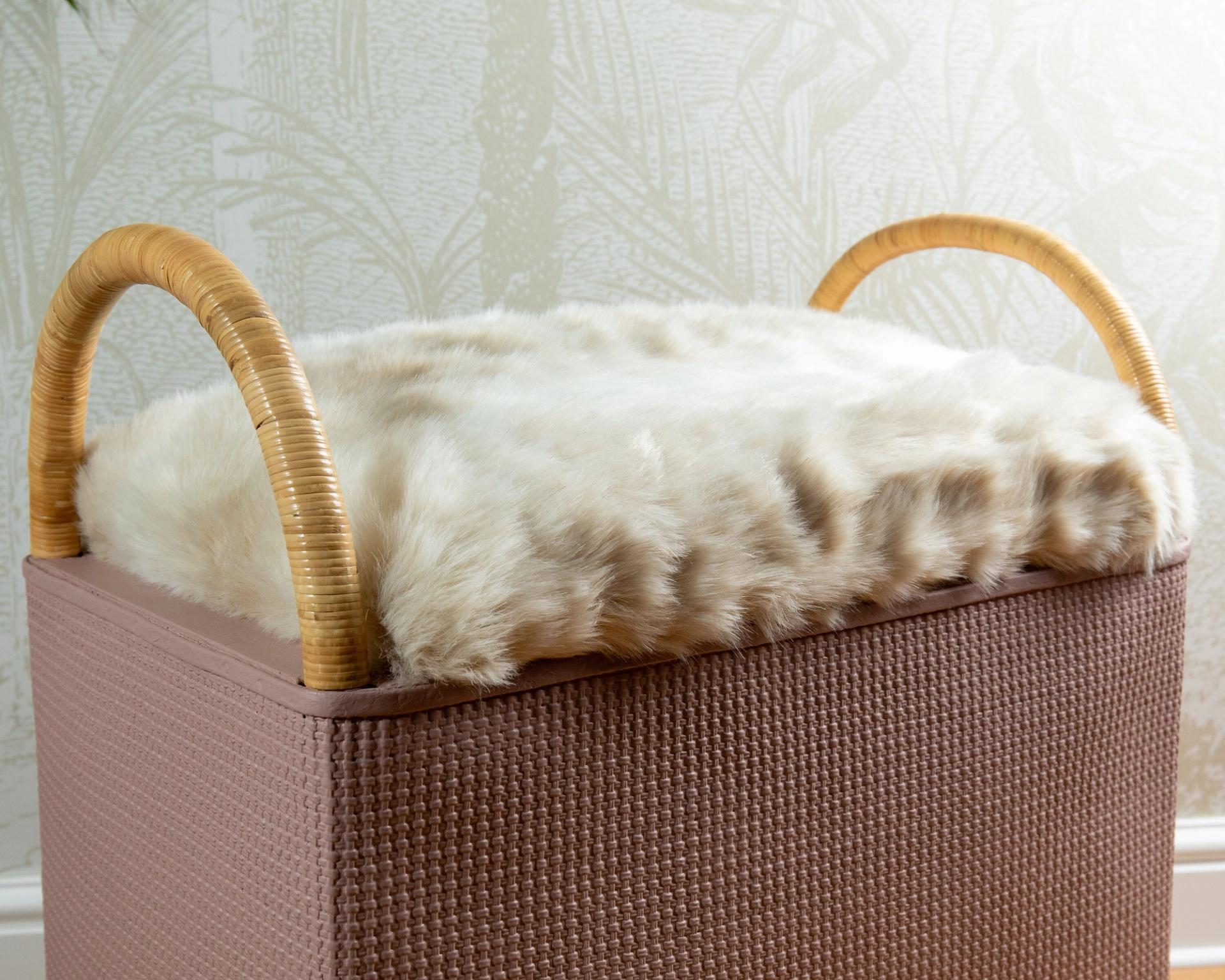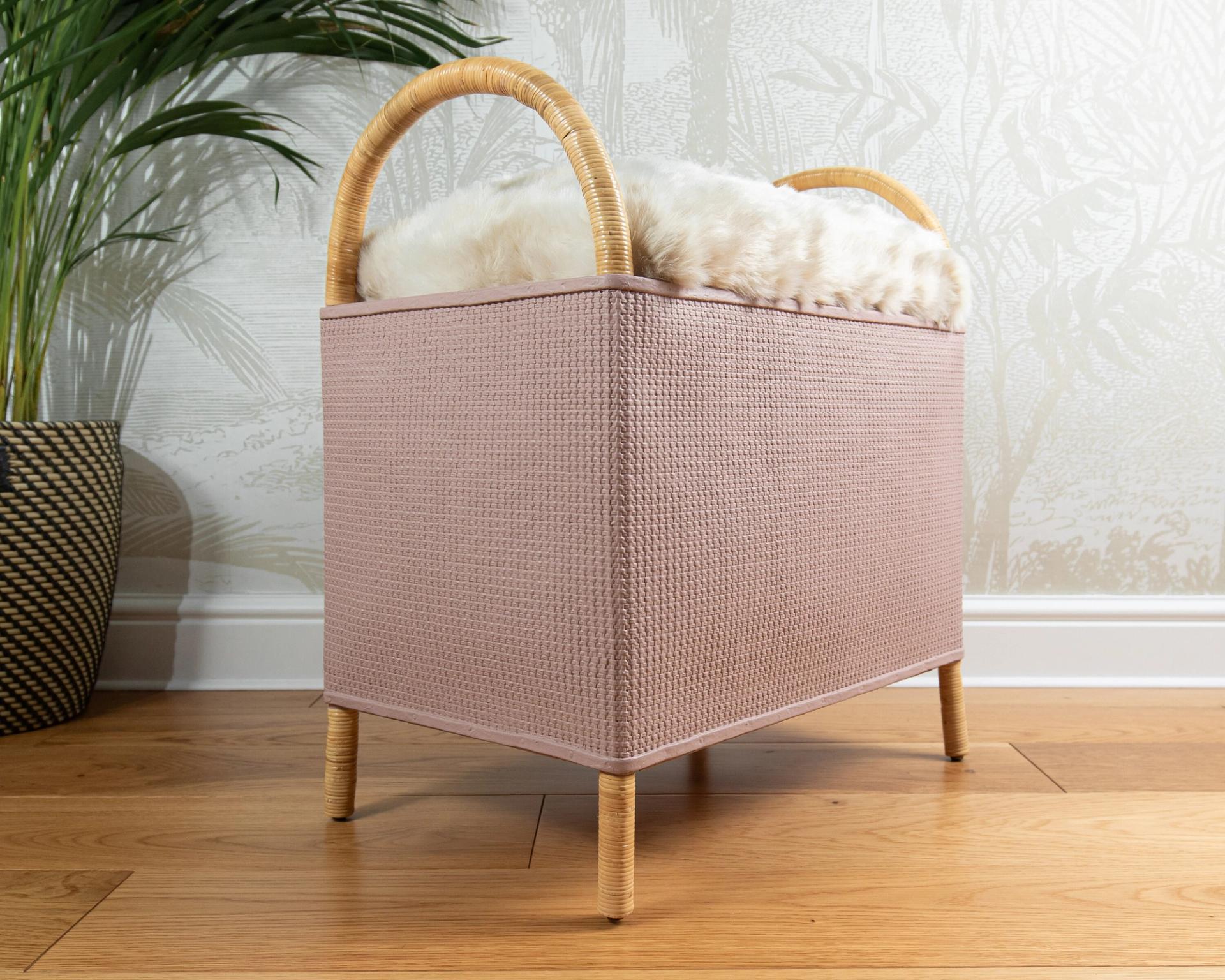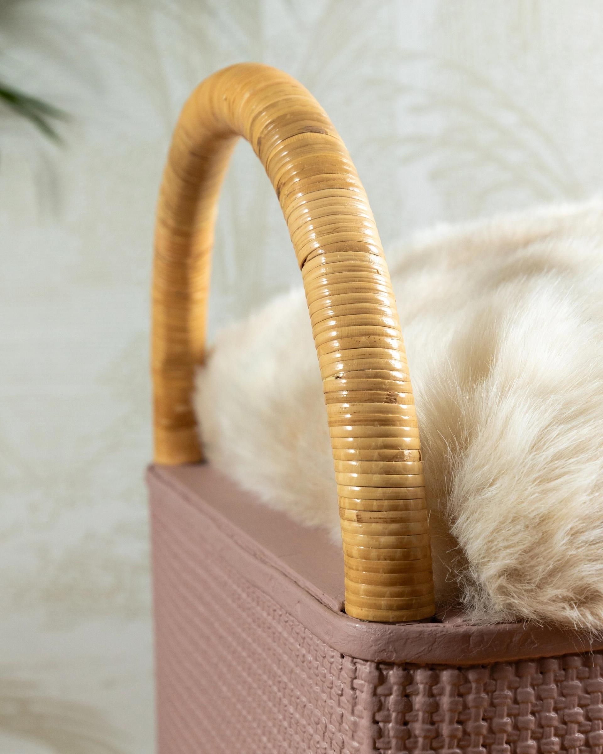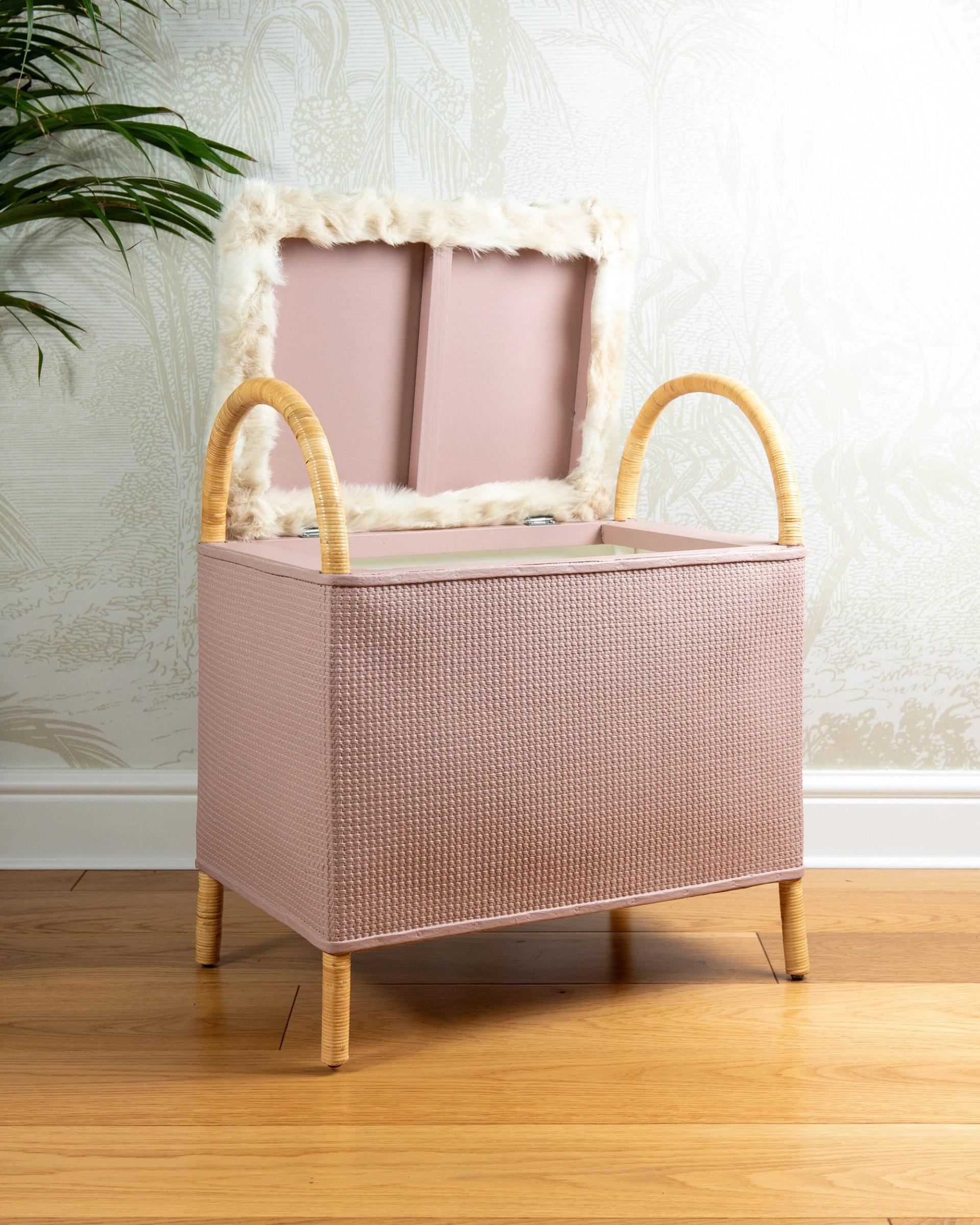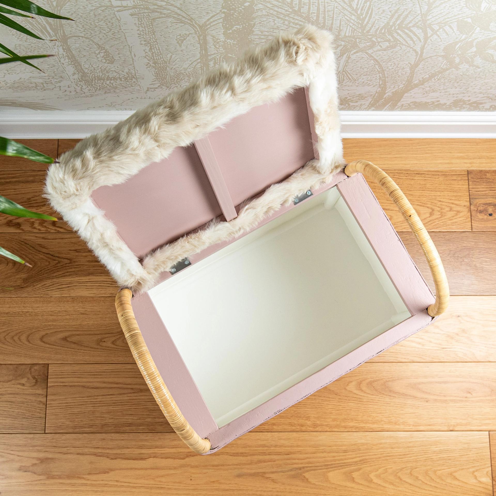 Lovingly restored, painted in Frenchic 'Dusky Blush' from the Al Fresco range for a durable finish. The bamboo handles and legs have been re wrapped in cane and varnished. The seat lid has been rebuilt and reupholstered and finished with faux fur fabric for a full boho look. The inside has had a new base and is painted in a brilliant white eggshell.