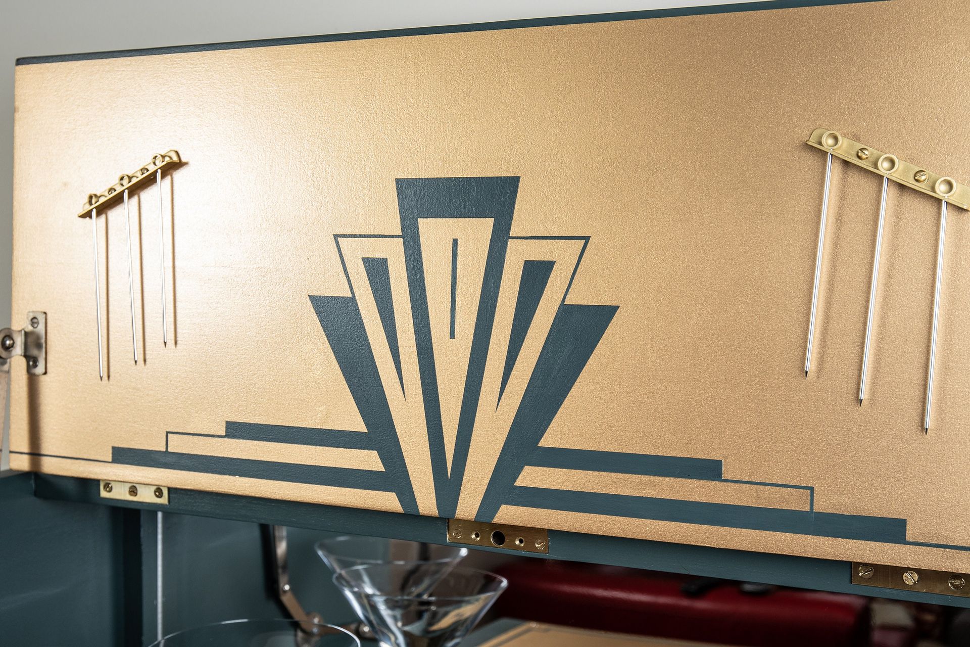 This has been fully refurbished, wih the walnut veneered door fronts restored to show off the fabulous wood grain. The main body and parts of the interior have been painted in a deep green aqua eggshell paint called 'Abyss'. Selected areas have been highlighted and trimmed in metallic gold paint. New matt gold flat handles and a new lock have been fitted.
