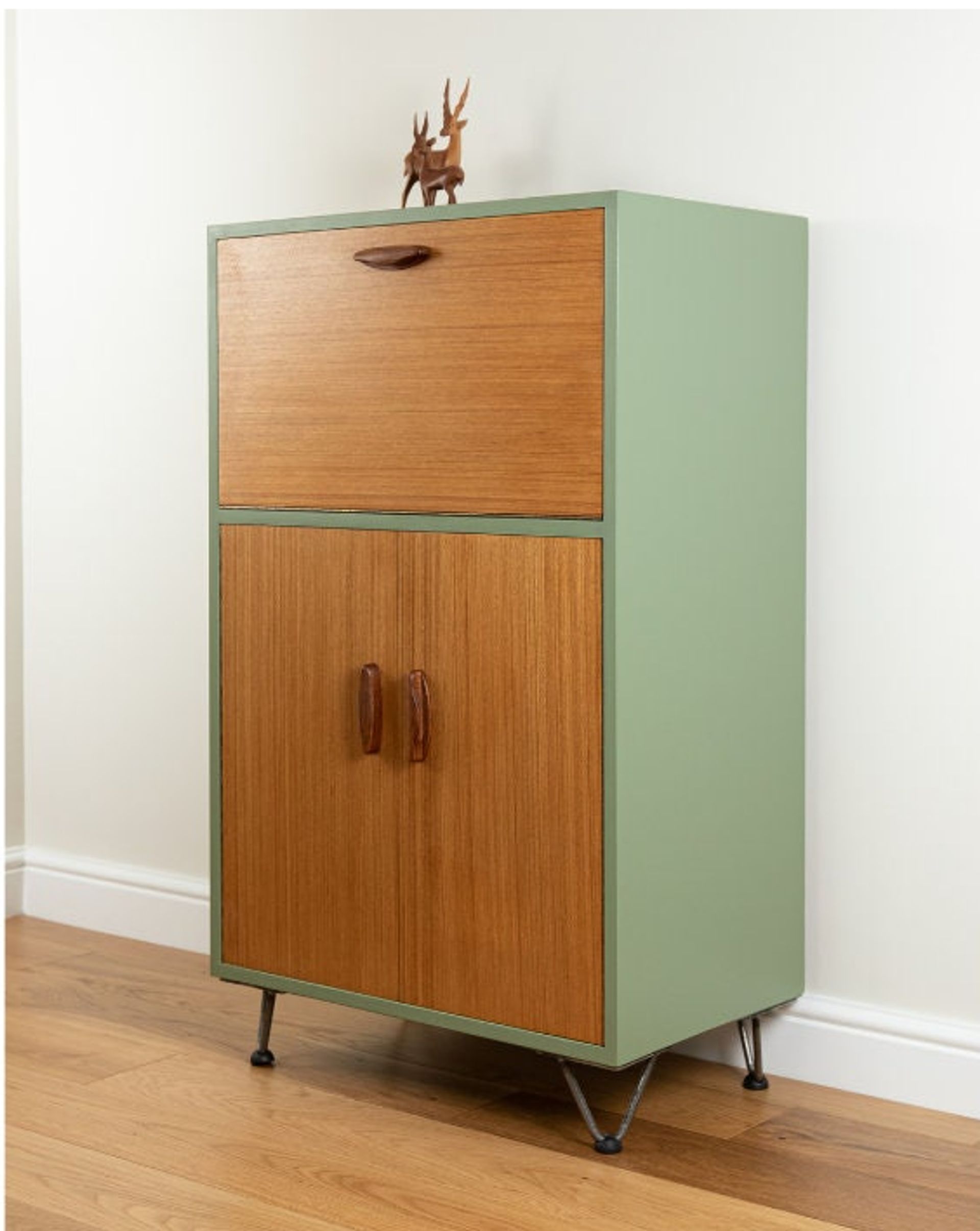 Painted in a pale moss green eggshell called 'Sepal' from Tikkurila. The wood has been refinished with hard wax oil and the interior has been lined with high quality paper.