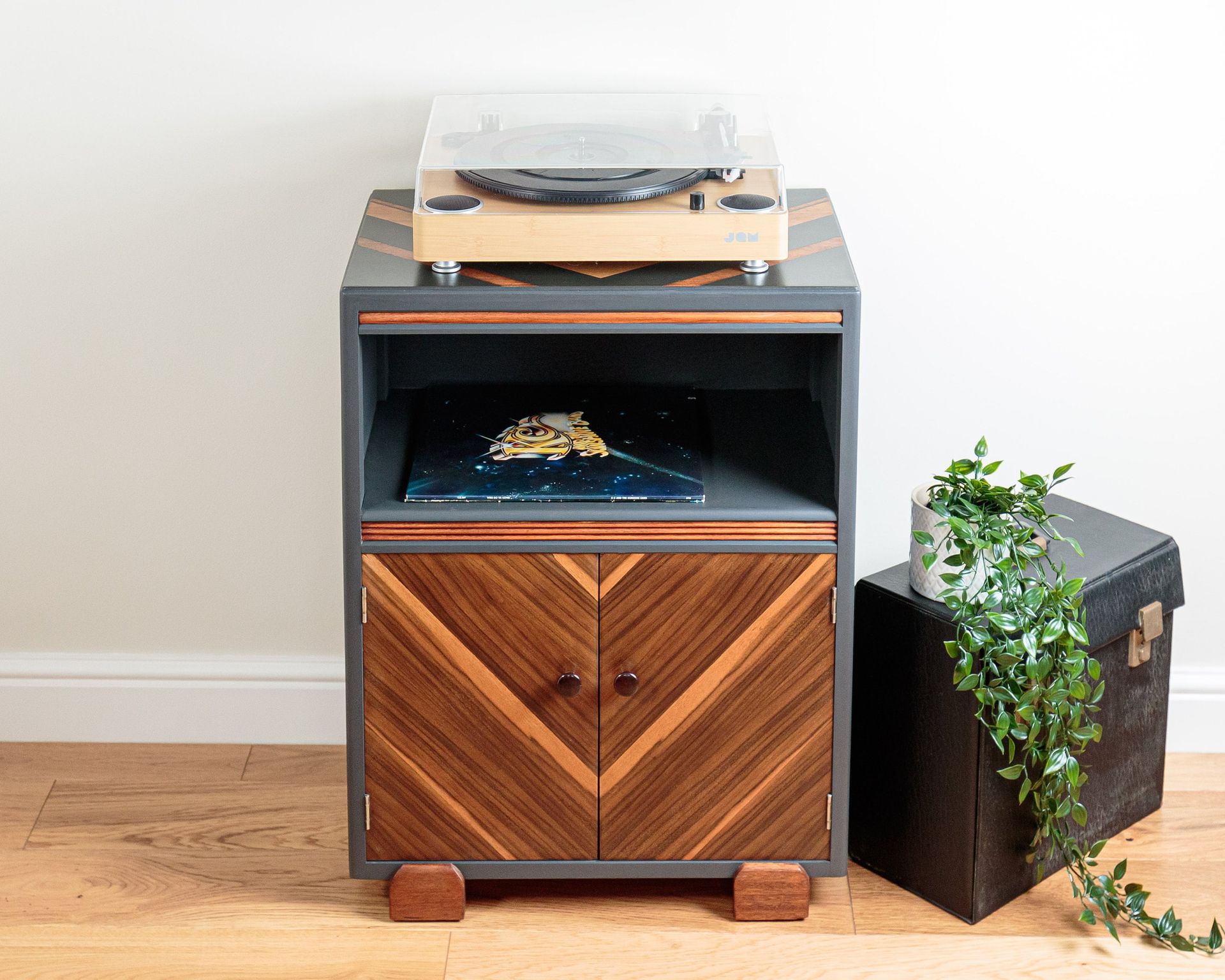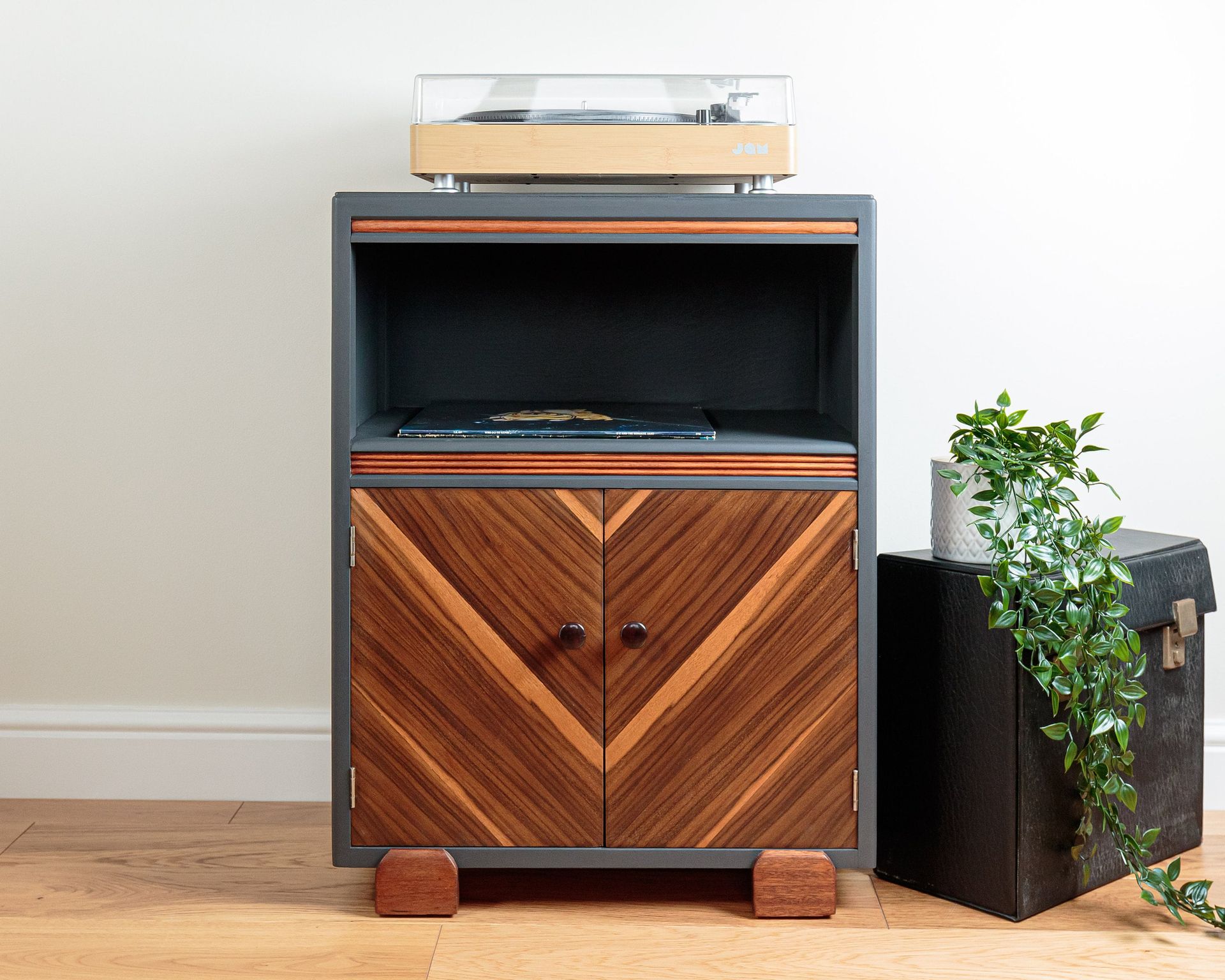 The doors have been refinished to show off the amazing wood veneers laid in a chevron pattern, which has then been mimicked in paint and bare wood on the top. The top has also been sealed with hard wax oil.