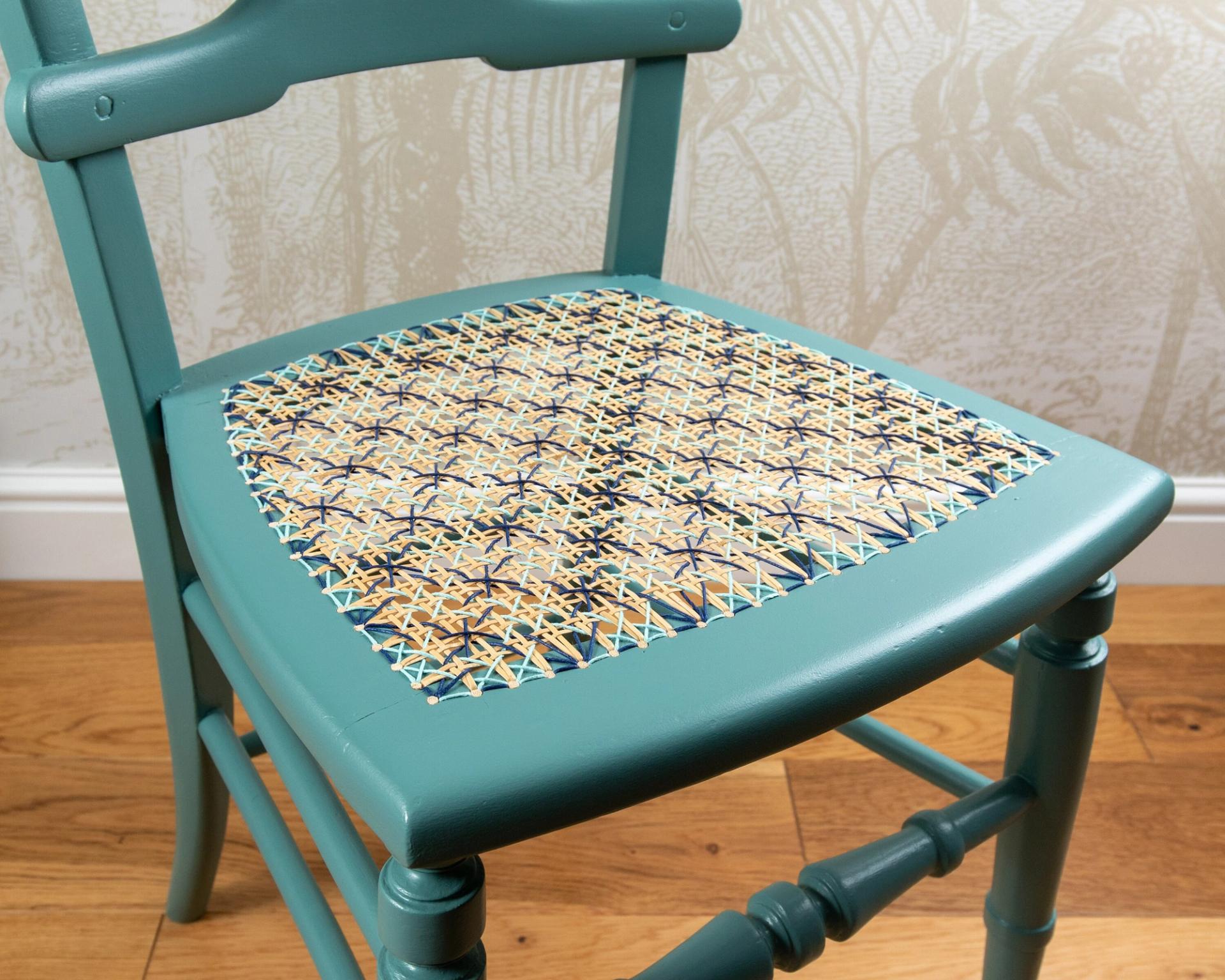 The seat has been returned to it's original cane design but with a twist. I have added in some waxed cotton threads to make the daisy and button pattern creating a unique, statement piece of furniture.