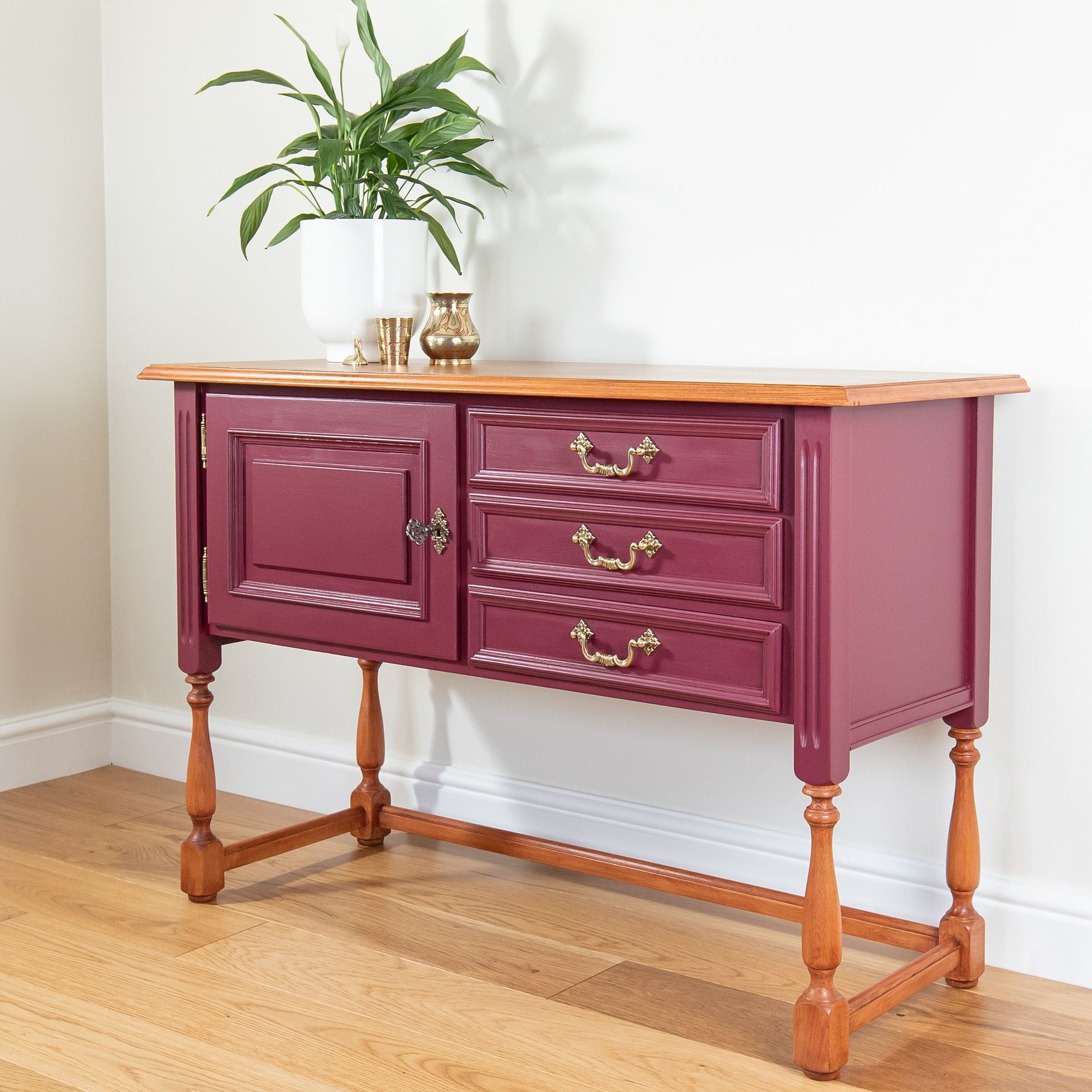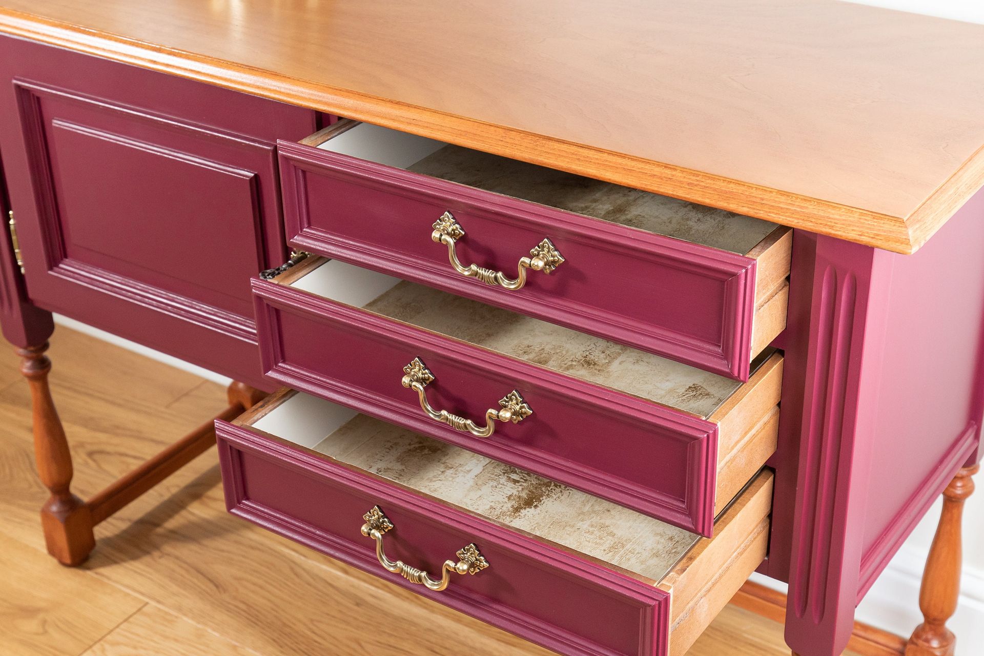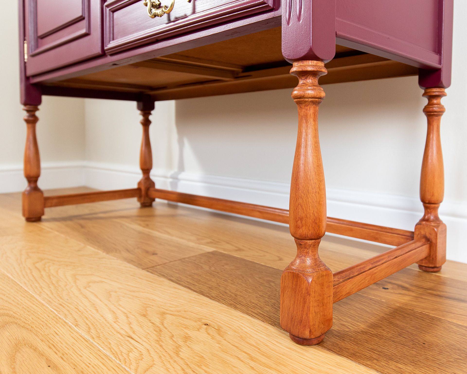 Fully refurbished and painted in a hard wearing eggshell called 'Tango' from Tikkurila. The top has been sanded back to reveal the mahogany veneer and it has been hard wax oiled for lasting protection.