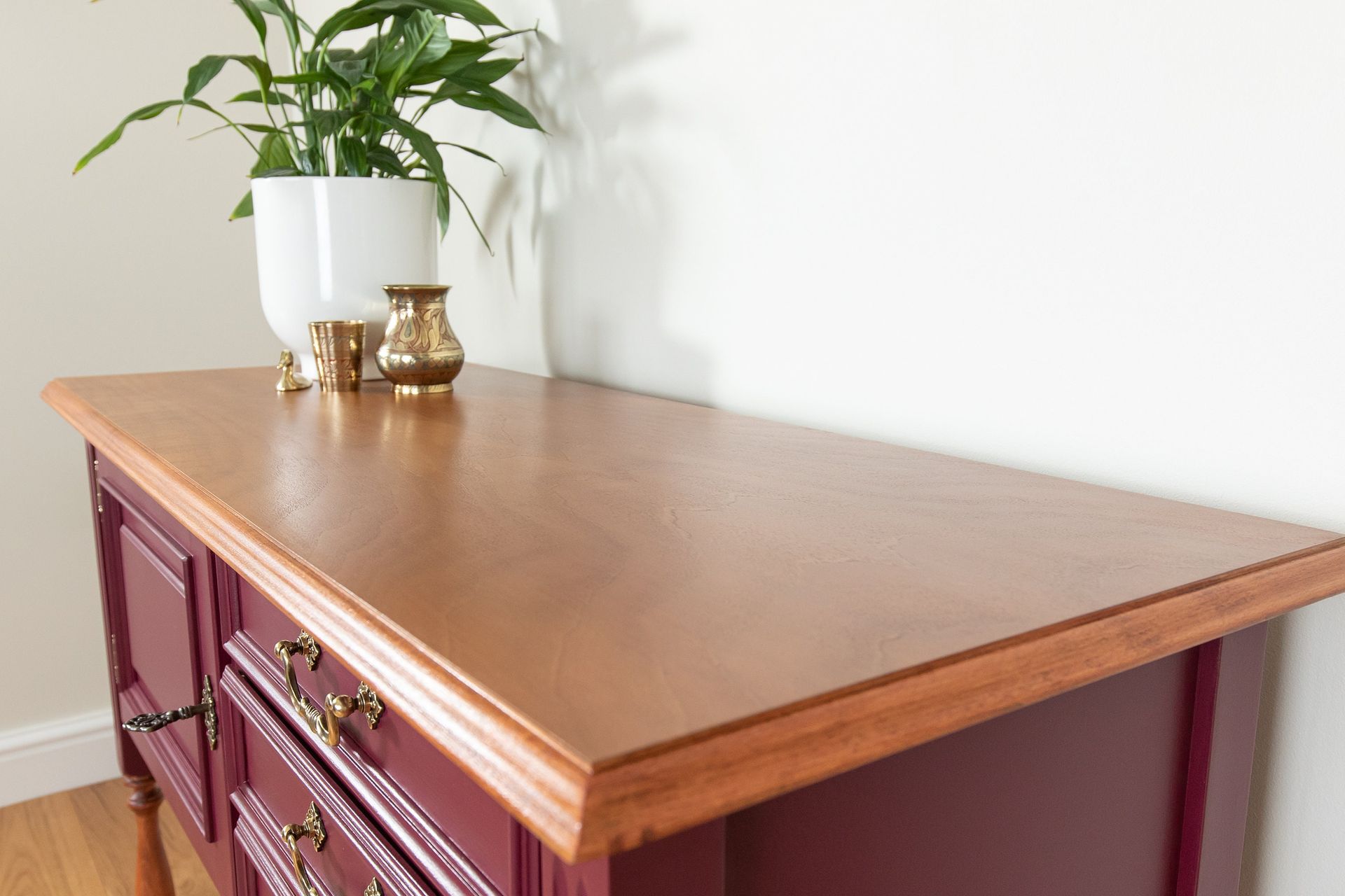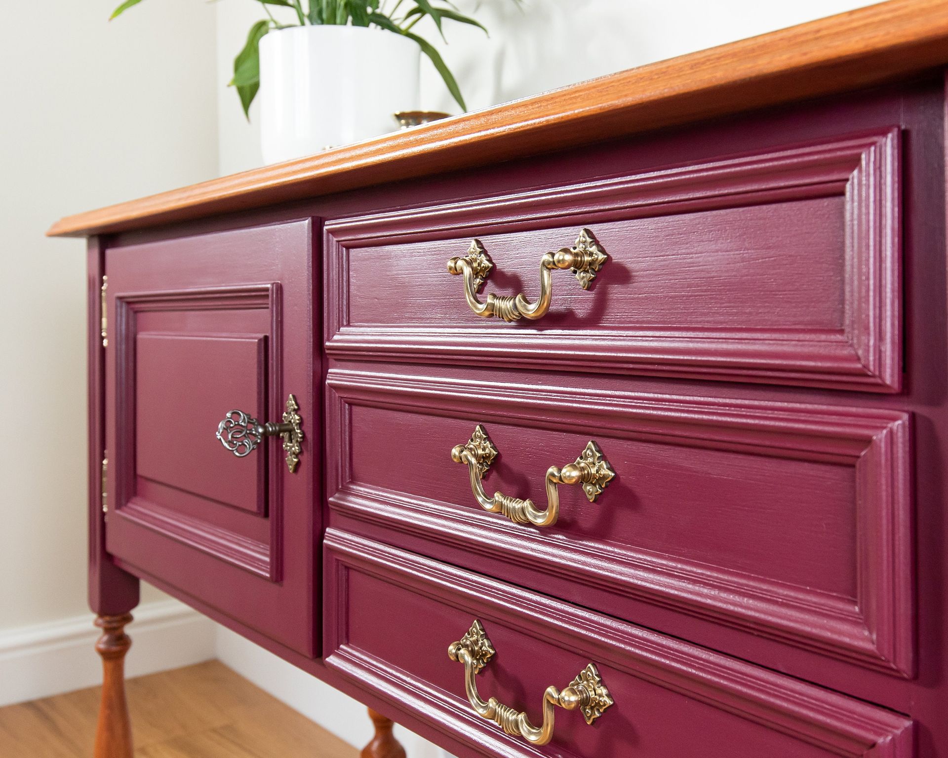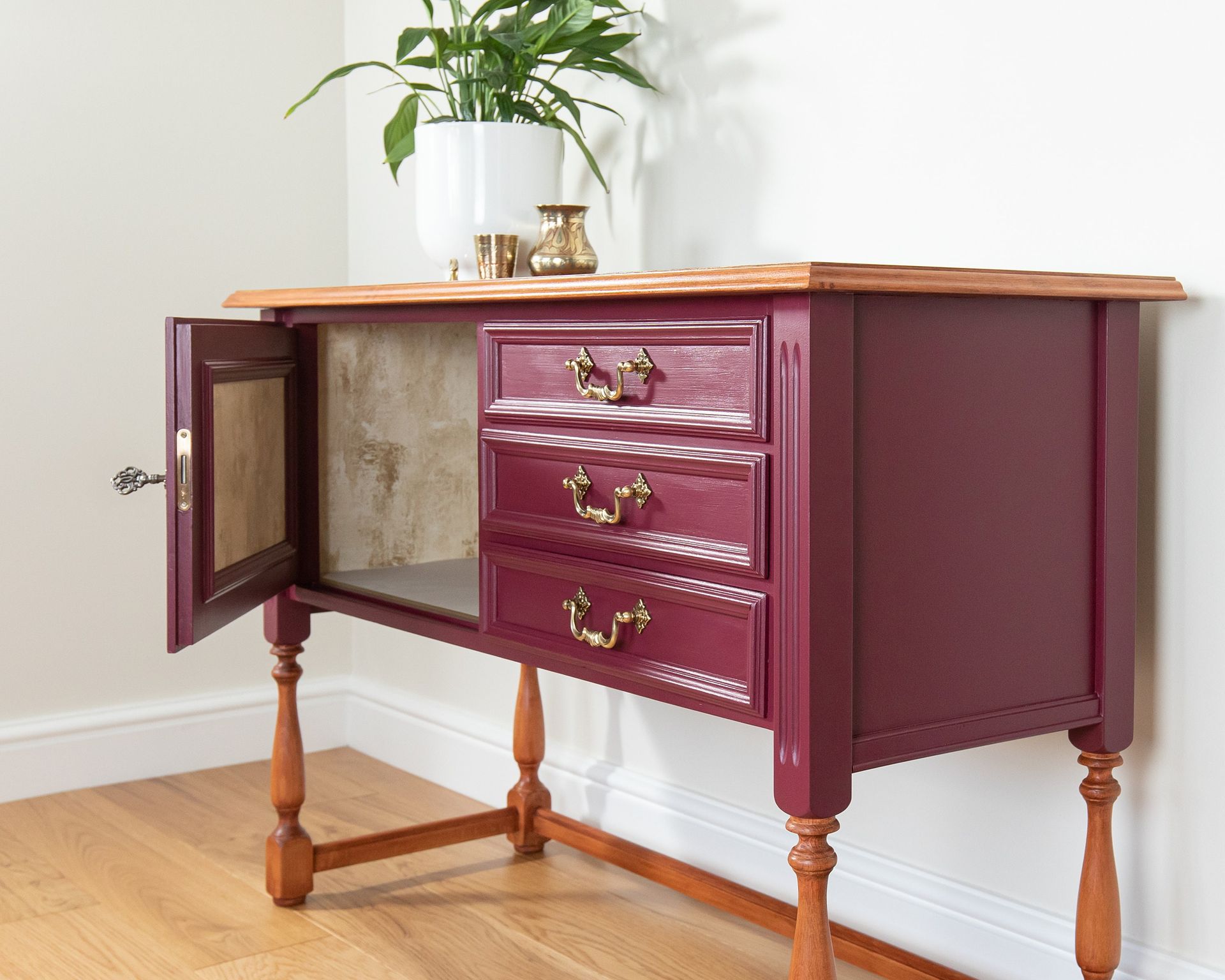 Fully refurbished and painted in a hard wearing eggshell called 'Tango' from Tikkurila. The top has been sanded back to reveal the mahogany veneer and it has been hard wax oiled for lasting protection.